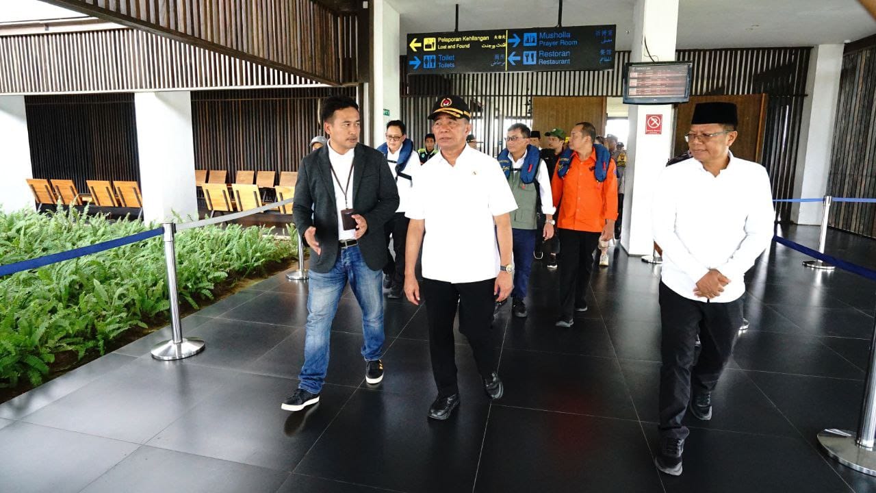 Menteri Koordinator Bidang Pembangunan Manusia dan Kebudayaan (Menko PMK), Muhadjir Effendy, meninjau langsung kesiapan Bandara Banyuwangi menyambut pemudik, Sabtu (6/4/2024). Turut mendampingi Muhajir, Sekretaris Daerah Banyuwangi, Mujiono.