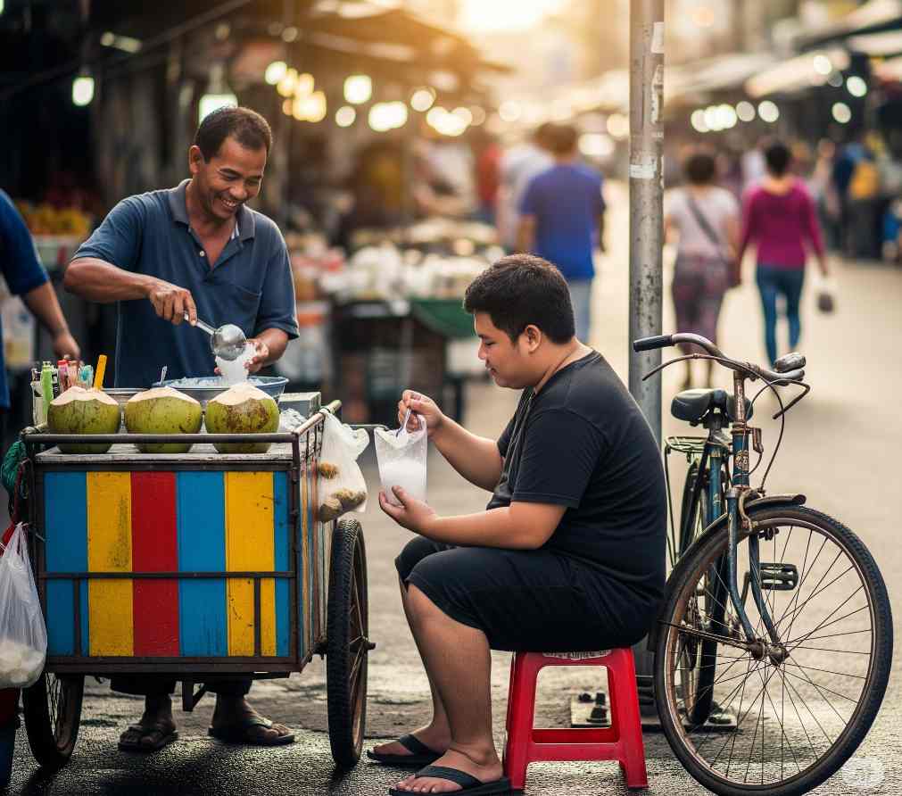 Saya duduk di bangku plastik sederhana, menyeruput es degan segar dengan potongan daging kelapa muda yang renyah. Segalanya terasa nikmat hingga sebuah kalimat dari Si Mamad, sang penjual es degan, memecah kesunyian: