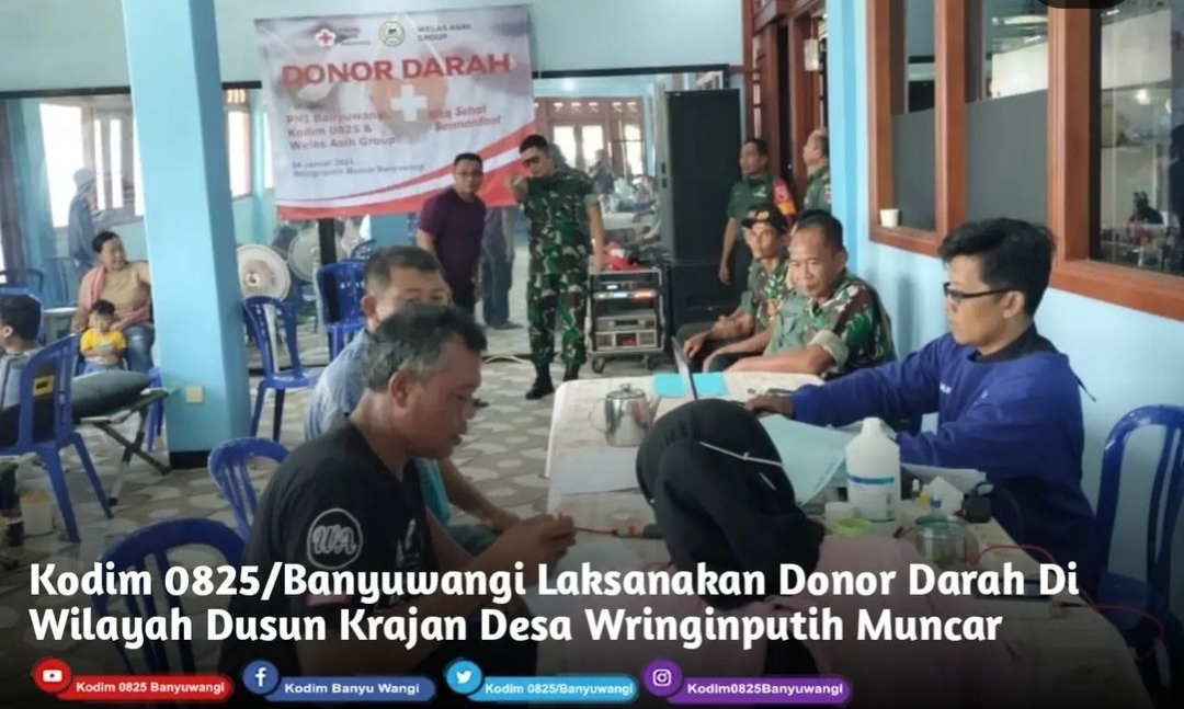 Banyuwangi – indonetizen.id | Kodim 0825/Banyuwangi bekerja sama dengan PMI Banyuwangi dan Yayasan Welas Asih Group telah melaksanakan kegiatan donor darah di Dusun Krajan Desa Wringinputih Kecamatan Muncar Kabupaten Banyuwangi. Kegiatan ini berlangsung sukses. Kamis 04/01/2024