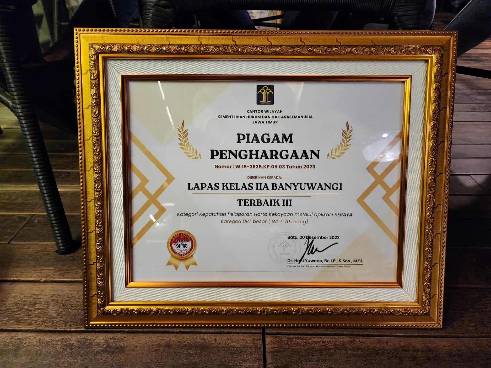 Kepala Lapas Banyuwangi, Agus Wahono, menyebut penghargaan yang diterima oleh Lapas Banyuwangi merupakan bentuk apresiasi dari Kanwil Kemenkumham Jatim atas kinerja yang telah dilakukan oleh jajarannya.